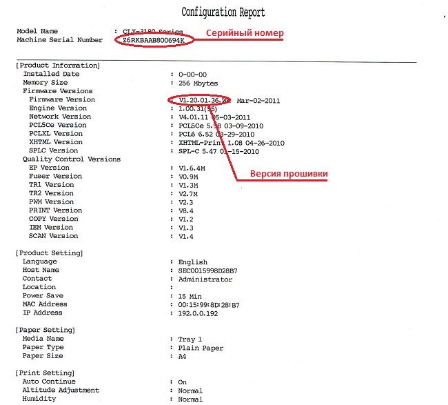 Образец отчёта Configuration Report Samsung CLX-3180N/3185N/3180FN/CLX-3185FN