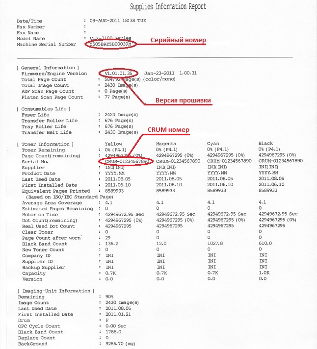 Образец отчёта Supplies Information Samsung CLX-3180N/3185N/3180FN/CLX-3185FN